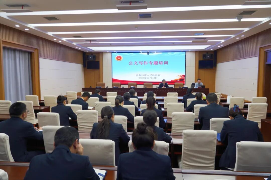 为进一步贯彻自治区党委办公厅、自治区政府办公厅关于公文抄袭问题专项整治工作的重要部署,落实“一院一策促发展”活动公文写作提升“五个一”举措,持续改文风转作风,提升全体检察人员公文处理能力,11月13日,扎鲁特旗检察院邀请旗委办秘书科负责人苏尼苏都同志开展专题培训,全体检察人员参加。