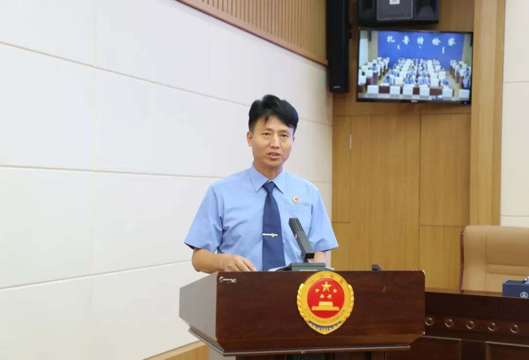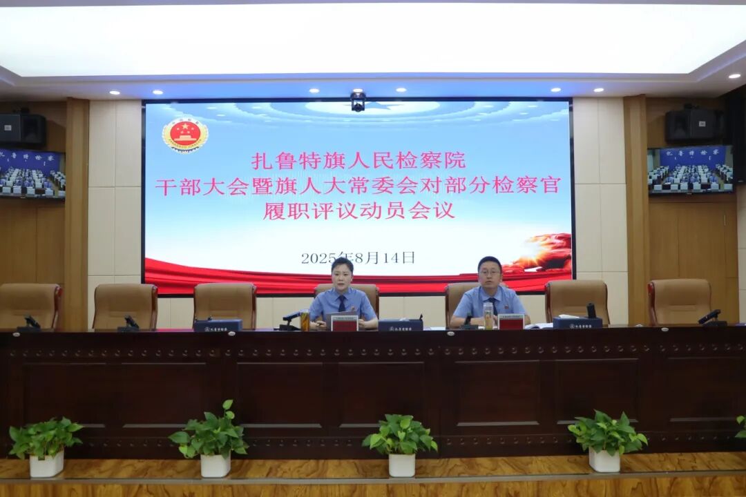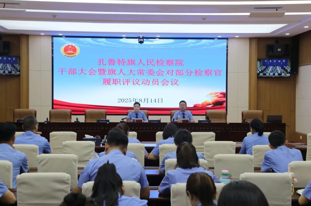 8月14日,扎鲁特旗检察院召开干部大会暨旗人大常委会对部分检察官履职评议动员会议。此次评议聚焦3名检察官在案件办理、法律监督、作风建设等关键环节的履职表现,旨在通过自查自纠、民主测评等方式,全面检视检察工作质效,提升检察官专业素养与责任担当。扎鲁特旗检察院党组书记、检察长曲叶红,在家党组班子成员及全体检察人员参加会议。