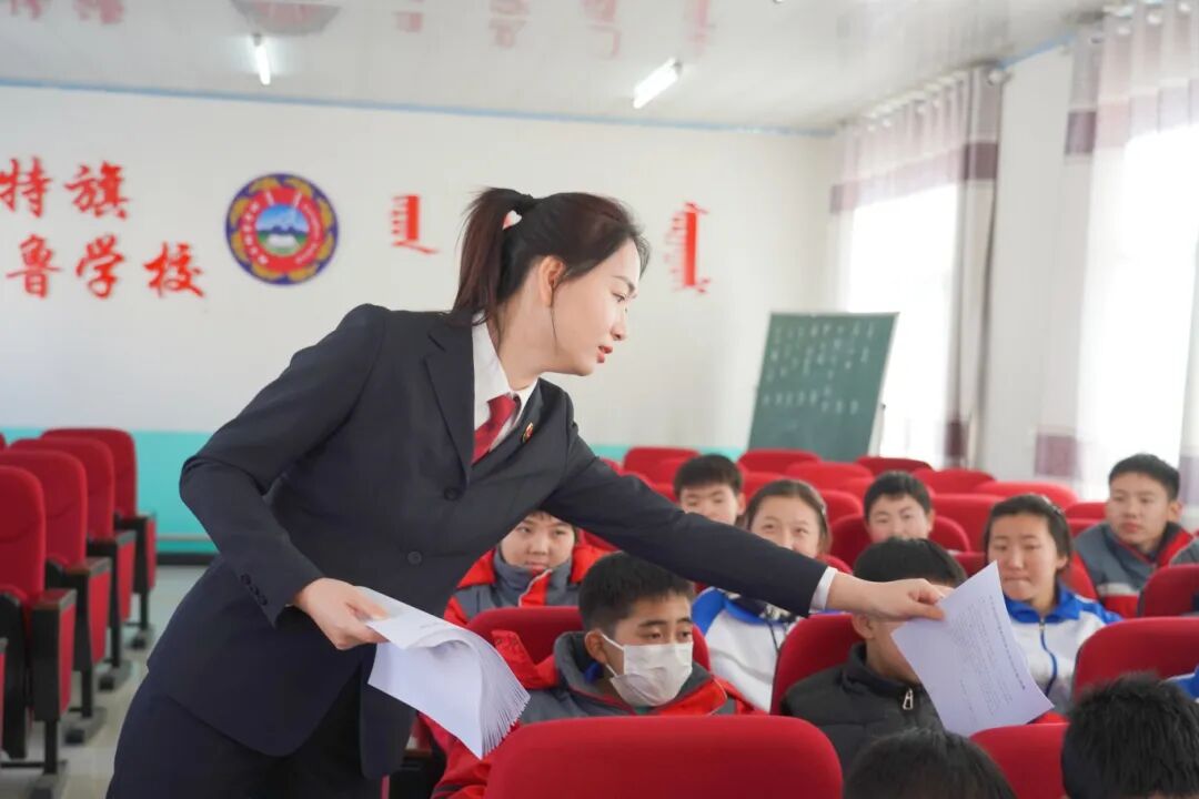 在格日朝鲁学校,一场充满关怀且深入人心的法治活动拉开帷幕。活动伊始,我院党组副书记、副检察长徐向东代表检察院向学校赠送了《未成年人保护法律全书》等普法书籍。精美的图书,承载着扎鲁特旗检察院对孩子们健康成长的深切关怀。希望通过这些书籍,将法治的种子播撒在孩子们心间,共同筑牢保护未成年人的坚强防线。