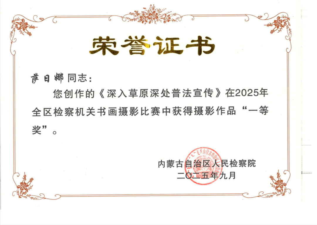 萨日娜荣获全区检察机关书画摄影比赛中,摄影作品荣获一等奖和三等奖,那仁满都拉荣获2025年改革创新驱动“双子星座”高质效检察履职检察理论研讨会三等奖。借势民族政策宣传月、法治宣传周,深入包联社区、乡村振兴帮扶点,以群众喜闻乐见的形式宣讲民族理论政策和法律法规,推动党建成果转化为基层治理效能。