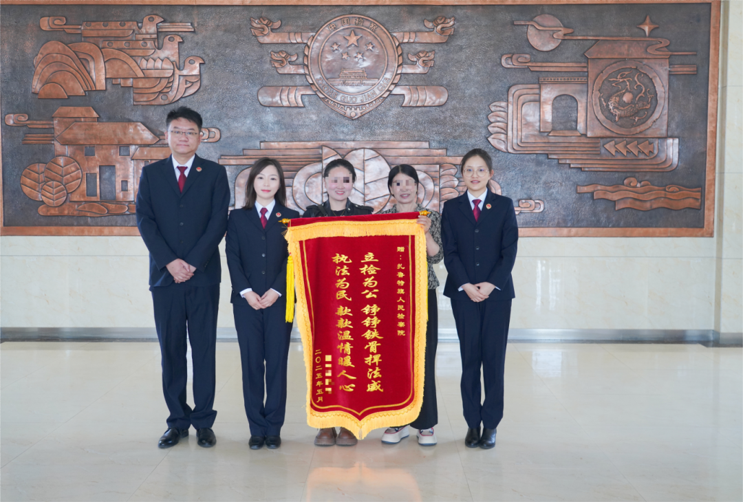 近日,扎鲁特旗检察院迎来了一位特殊的访客——嫌疑人周某某和其母亲手捧一面印有“立检为公 铮铮铁骨捍法威 执法为民 款款温情暖人心”的锦旗,眼含热泪走向承办检察官,将锦旗郑重交到检察官手中,并情不自禁地给了检察官一个深情的拥抱。这一场景,正是扎鲁特旗检察院践行“以人民为中心”司法理念的生动缩影。