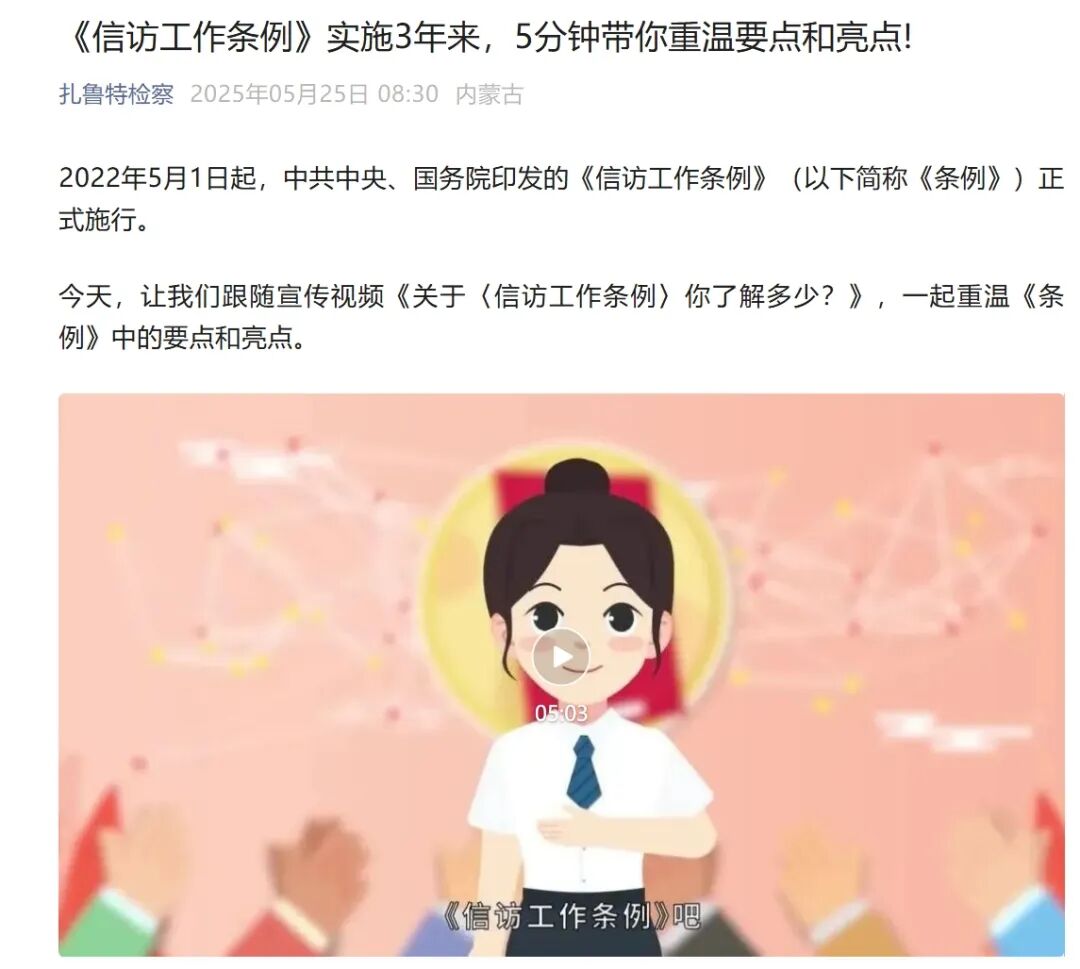 在线上,扎鲁特旗检察院充分发挥新媒体平台传播优势,依托官方微信公众号,精心策划推出信访法治化宣传专栏。专栏以图文并茂、通俗易懂的形式,多维度解读《信访工作条例》、信访工作法治化,围绕信访的受理范围、办理流程、群众依法享有的权利和义务等内容,进行深入浅出的阐释。