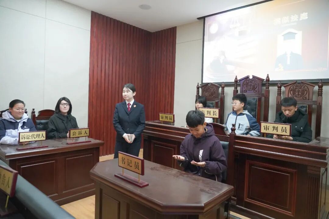 模拟法庭区域,孩子们轮流扮演法官、检察官、辩护人等角色。“现在开庭!”随着“小法官”敲响法槌,模拟庭审正式开始。孩子们神情专注,认真投入。“通过角色扮演,我更理解了每个法律职业的责任,也明白了法庭的庄严。”